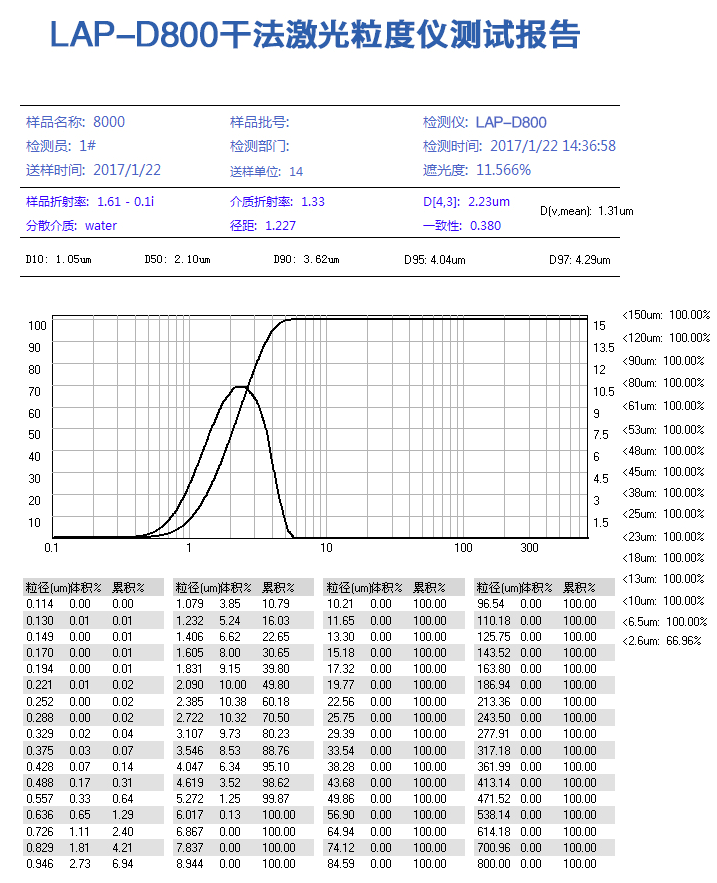 顯示模闆(pǎn) | 粒徑區間求(qiú)百分比,以滿足不(bú)同行業對粒度測(cè)試的表征方式。徑(jìng)距、一緻性、區間累(lei)積等等 |