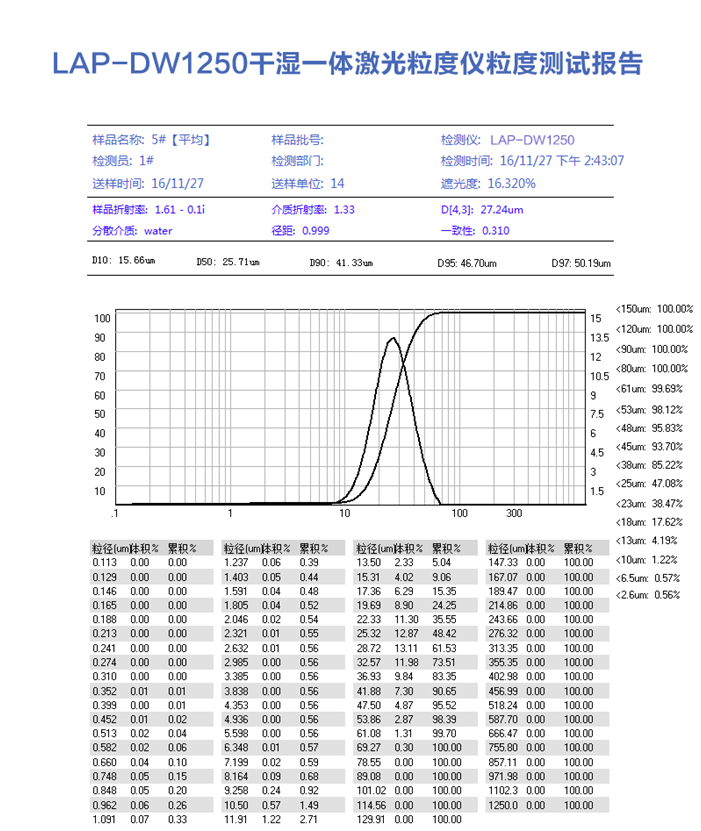 LAP-DW1250是我公司(sī)傾力研發的新(xīn)産品,自上市以(yi)來赢得了廣大(da)客戶的*。LAP-DW1250采用*的(de)Mie式散射原理和(hé)彙聚光傅立葉(yè)㊙️變換光路。高密(mi)度探頭及全量(liàng)程無縫銜接測(ce)試方法,保證了(le)測試結果的準(zhun)确性🙇🏻和重複性(xing)。